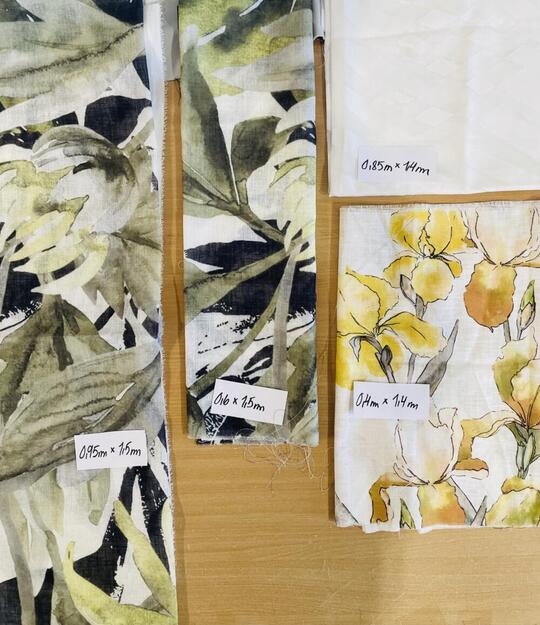 Lajitelma kevyitä palakankaita, kangaspalojen koot näet kuvassa kankaan päällä olevasta lapusta