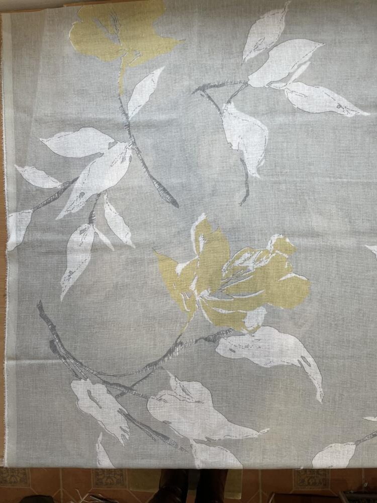 Kevyt läpikuultava verhokangas herkällä kukkakuosilla. Pohjan väri hennon vihertävä vaaleanharmaa