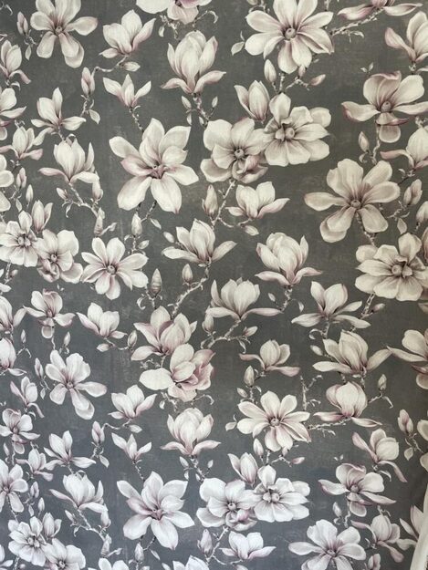 Kankaan leveys 140cm. Kuvion korkeus 63cm. Pohjan väri harmaa. Tiivis akryylikangas ulkokäyttöön, liinoiksi, verhoiluihin, tyynyihin yms.