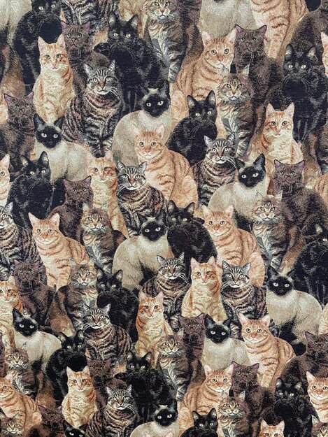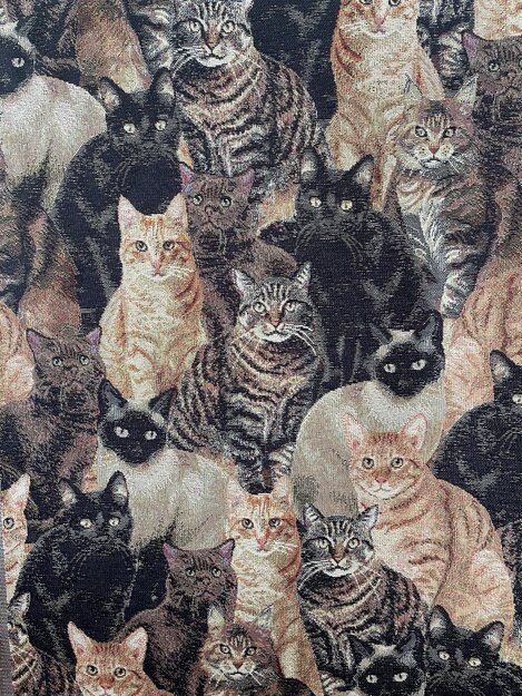 Gobeliinikangas, jossa kissoja. Kankaan leveys 140cm, gobeliinia, käy esim. tyynyt, laukut ym. Kissan päät n.6x6cm.Yhdessä kuvassa koko kankaan leveys.