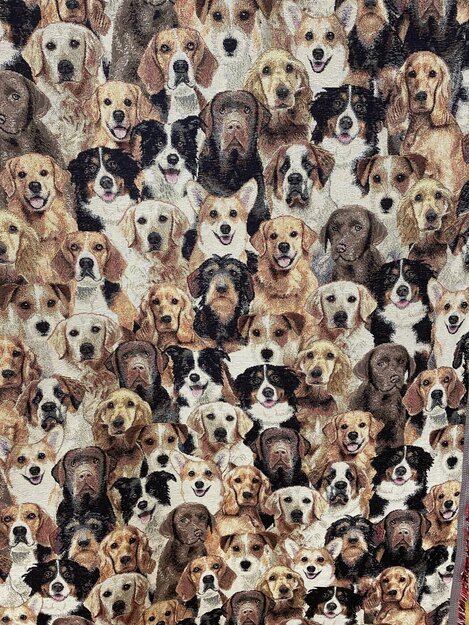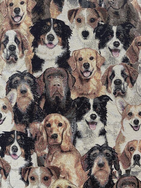 Gobeliinikangas, jossa koiria. Kankaan leveys 140cm, gobeliinia, käy esim. tyynyt, laukut ym. Koirien päät n.7x7cm.Yhdessä kuvassa koko kankaan leveys.