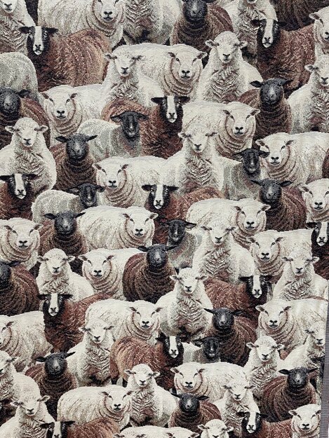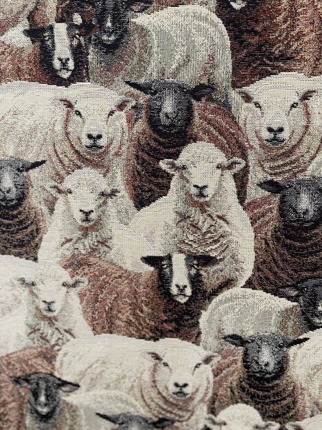 Gobeliinikangas, jossa lampaita. Kankaan leveys 140cm, gobeliinia, käy esim. tyynyt, laukut ym. Lampaiden päät n.5x5cm.Yhdessä kuvassa koko kankaan leveys.