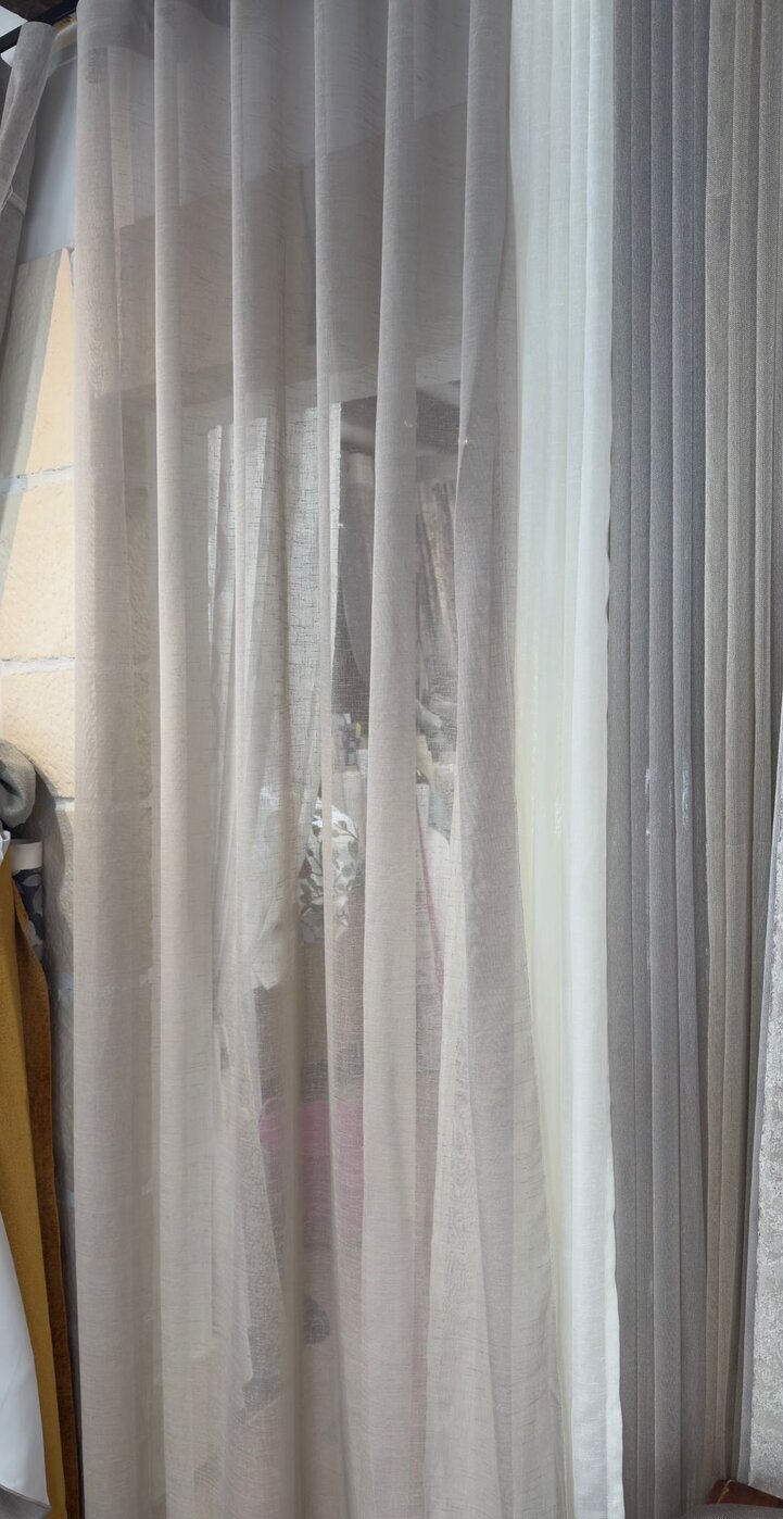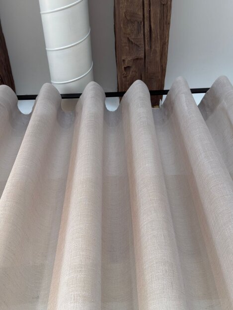 Kankaan leveys 320cm. Kauniisti laskeutuva pellavaimitaatio. Toisessa reunassa lyijynauha, eli tilaa verhon leveyden verran kangasta.